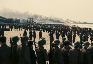 Above: Allied soldiers line the beach in 'Dunkirk'