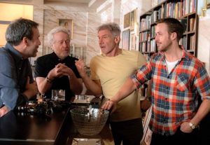 Above: Denis Villeneuve and Ridley Scott chat with actors, Harrison Ford and Ryan Gosling
