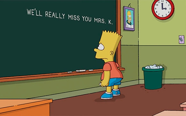In the opening sequence of Sunday night’s episode, Bart writes “We’ll miss you Mrs. K” on the board in reference to Wallace’s character Edna Krabappel.